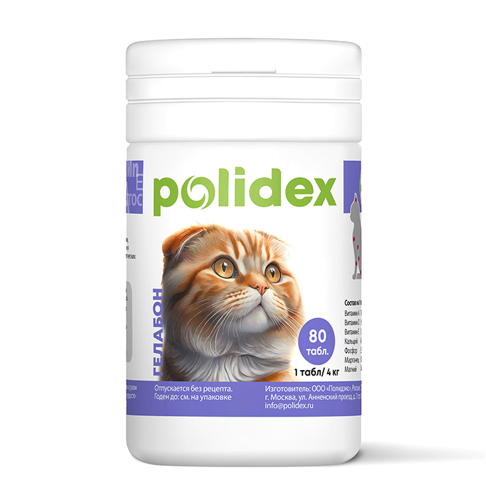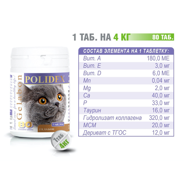 POLIDEX Gelabon (Гелабон) для кошек 80 таб (1 таблетка на 4 кг). « ГЕЛАБОН » предназначен для эффективной профилактики заболеваний хрящевых поверхностей суставов, связок, регуляции кальций фосфорный обмена. Основными компонентами препарата являются: Гидролизат коллагена – белок, обеспечивающий прочность и эластичность хрящей, стенок сосудов и связывающих тканей; Метилсульфанилметан (МСМ) – форма биодоступной серы, необходимой для синтеза соединительной ткани, в т.ч. коллагена и кератина. В состав кормовой добавки для повышения метаболической эффективности основных компонентов входят витамины, микро– и макроэлементы, таурин, ТГОС. ПРЕИМУЩЕСТВА: