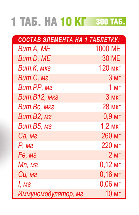 Состав: в одной таблетке: Витамин А – 500 МЕ; Витамин D – 40 МЕ; Витамин К – 300 мкг4 Витамин Е- 6 мг; Витамин С – 4 мг; Витамин В2 – 0.3 мг; Витамин В5– 1.2 мг; Витамин В6– 0.15 мг; Витамин B12 – 3.5 мкг; Витамин Bс – 50 мкг; Магний- 8 мг; Кобальт- 0.2 мг; Железо – 6 мг; Марганец – 0.4 мг; Медь – 0.6 мг; Цинк- 0.6 мг; Йод – 0.06 мг; Иммуномодулятор – 10 мг.