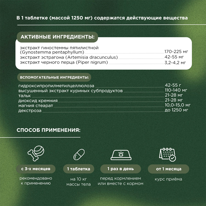 Состав: В 1 таблетке (массой 1250 мг) содержатся действующие вещества: экстракт гиностеммы пятилистной (Gynostemma pentaphyllum) – 170-225 мг, экстракт черного перца (Píper nígrum) – 3,2-4,2 мг, экстракт эстрагона (Artemísia dracúnculus) – 42-55 мг; вспомогательные вещества: высушенный экстракт куриных субпродуктов – 110-140 мг, гидроксипропилметилцеллюлоза – 42-55 г, магния стеарат – 10,0-15,0 мг, тальк – 21-28 мг, диоксид кремния – 21-28 мг, декстроза – до 1250 мг.