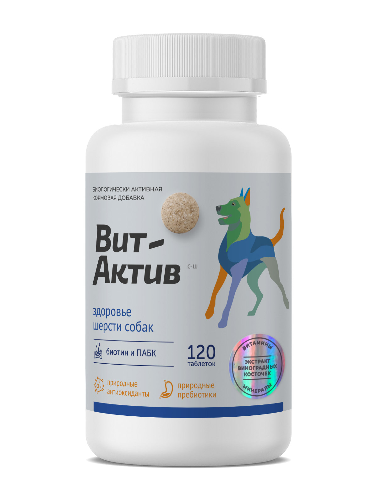 ВИТ-АКТИВ витаминно-минеральная кормовая добавка для здоровья шерсти собак, 120таб, ФАРМАКС