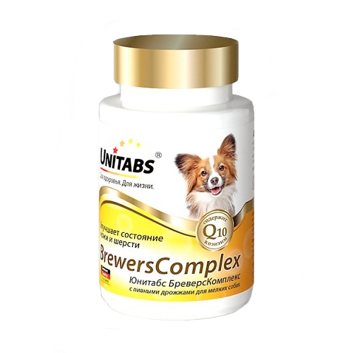 Unitabs BrewersComplex — это витаминно-минеральный комплекс для собак, который содержит коэнзим Q10 и все необходимые витамины, макро- и микроэлементы для улучшения состояния кожи и шерсти.
