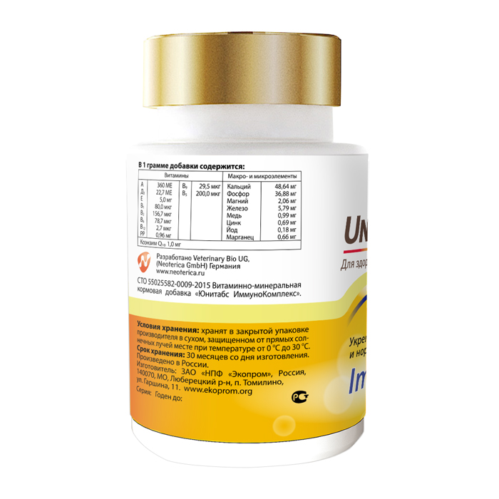 В состав Unitabs ImmunoComplex входит 21 элемент для комплексного действия: коэнзим Q10, витамины А, D3, Е, В1, В2, В6, В12, РР, В9, В5, кальций, фосфор, магний, железо, медь, цинк, йод, марганец, омега-6 и омега-3. Оптимальный баланс витаминов, макро- и микроэлементов способствует повышению иммунной сопротивляемости организма на протяжении всей жизни собаки и в периоды восстановления после болезни.