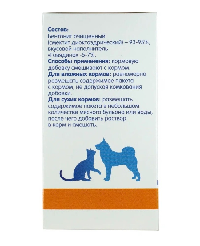 Состав: в 1 г кормовой добавки содержится действующее вещество - бентонит очищенный (смектит диоктаэдрический) - 93-95%, вспомогательное вещество вкусовой наполнитель "Говядина"-"Гурман FL 606" - 5-7%.