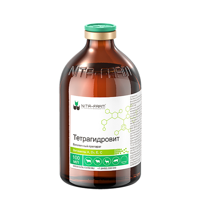 Тетрагидровит, раствор для инъекций, 100мл. Доступный водно-дисперсный комплекс жирорастворимых витаминов для молодняка животных. ФАРМАКОЛОГИЧЕСКИЕ СВОЙСТВА: Тетрагидровит восполняет недостаток витаминов в организме животных. Витамин А регулирует строение, функции и регенерацию эпителиальных тканей и тем самым повышает сопротивляемость инфекции. Витамин D₃ регулирует обмен кальция и фосфора и влияет на их всасывание в желудочно-кишечном тракте, обладает противорахитным действием, тем самым позволяя профилактировать заболевания костной ткани. Витамин Е регулирует окислительно-восстановительные процессы и влияет на углеводно-жировой обмен, усиливает действие витаминов А и D₃. Витамин С является важным фактором нормального роста и повышает защитные функции организма. ПОКАЗАНИЯ К ПРИМЕНЕНИЮ: Тетрагидровит применяют для профилактики и лечения гиповитаминозов, нормализации обмена веществ:
